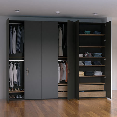 Παράλληλα σας προσφέρει λύσεις για ολοκληρωμένα συστήματα ντουλάπας με ανοιγόμενες ή συρόμενες πόρτες, σε ότι διάσταση διευκολύνει τη διαμόρφωση, καθώς και τον εντοιχισμό της τελικής κατασκευής στα μέτρα του χώρου σας. Ευέλικτες ντουλάπες με μεγάλη επιλογή εσωτερικής διαρρύθμισης των συστημάτων βάσει των ιδιαίτερων αναγκών σας σε ότι στιλ και χρωματολόγια, ταιριάζει στο δικό σας χώρο. Μαζί μπορούμε να σχεδιάσουμε ντουλάπες σε χρώματα και σχέδια που ικανοποιούν κάθε σας επιθυμία μέσα από μία μεγάλη γκάμα από σχέδια και χρώματα που καλύπτουν και το πιο απαιτητικό γούστο. Λαμβάνοντας πάντα υπόψη μας όλους τους σημαντικούς παράγοντες όπως την έξυπνη διαρρύθμιση, τη λειτουργικότητα και την καλύτερη εκμετάλλευση του χώρου σας.